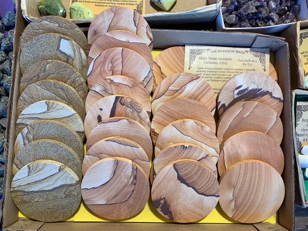 Speaking of a magic more potent than tenderstem broccoli, the largest stand by far at the market is the “The Science of Magic.” This well-stocked shop for all things rock, meteor, fossil, and holistic-good-vibes-manifesting-ism, always has a solid gaggle of customers, likely due to the amazing variety of wares. Various rocks and natural objects are displayed with their “healing benefits” of which I am admittedly a skeptic (I do credit them for their comprehensiveness in that sphere, they even sell smudge sticks). All the same I love browsing this stand as it evokes fond memories of our honeymoon visit to Kehoe’s Agate Shop in Montana, likewise a haven of dinosaur teeth and shiny rocks of various hues. Amusingly, some of their most prominently displayed products are these Arizona-originated coasters.