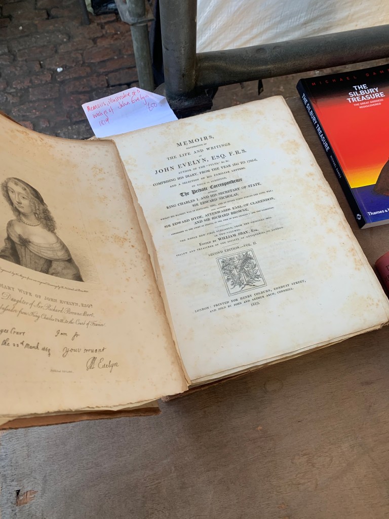The bookstand at the market never fails to disappoint with fun surprises alongside the expected piles of British history books. On one occasion, the liturgy nerd in me was really fired up by a 19th century Anglican missal laid out with a Gregorian Chant coffee-table-book, two tantalizing delights for which I have no room in the allotment of suitcases provided for our return to the States. Sometimes there are vintage gems such as this 1819 edition of the memoirs of John Evelyn. The fact that I had never heard of this revered English diarist appears to be the fault of Samuel Pepys, whose diary outshone Evelyn’s (perhaps why such a venerable tome is relegated to an open-air bookstand rather than a glass case. Just enough of the books are thematically categorized that the anomalies pop out all the more, and it is the inexplicable juxtapositions of certain books that keep me coming back. Why, for example, was Evelyn displayed alongside a radical pagan archaeological theory from the 1970s? On another occasion, why was a book onJack the Ripper neatly aligned with the Oxford Classical Dictionary? I am convinced that there is a secret logic to these choices and solving the conundrum fascinates me. This bookstand also has an excellent selection of out-of-print editions of children’s literature (Beatrix Potter and Roald Dahl especially well-represented) that piques my interest every time – again, were it not for the constraints of moving back to America, I would be carrying off a boatload of books every time.